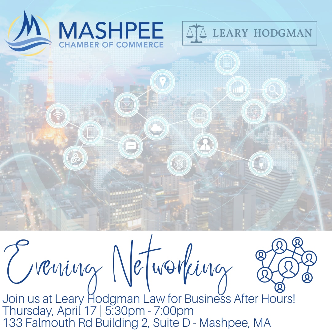 Join us on Thursday, April 17 for some Business After Hours networking fun at Leary Hodgman Law in Mashpee. Open to all!