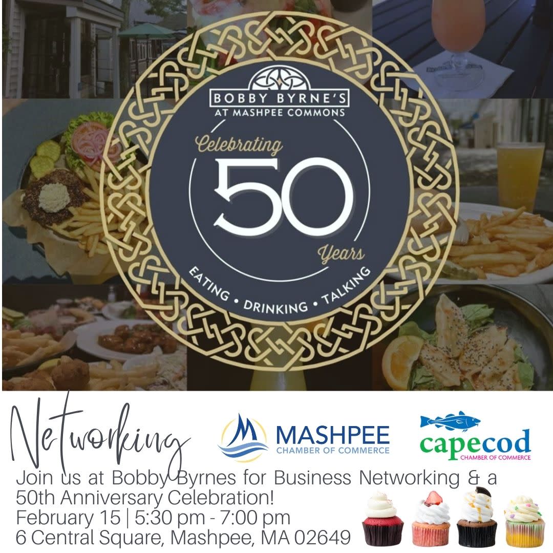 Join us at Bobby Byrnes for Business Networking & a 50th Anniversary Celebration! February 15 | 5:30 pm - 7:00 pm 6 Central Square, Mashpee, MA 02649Images