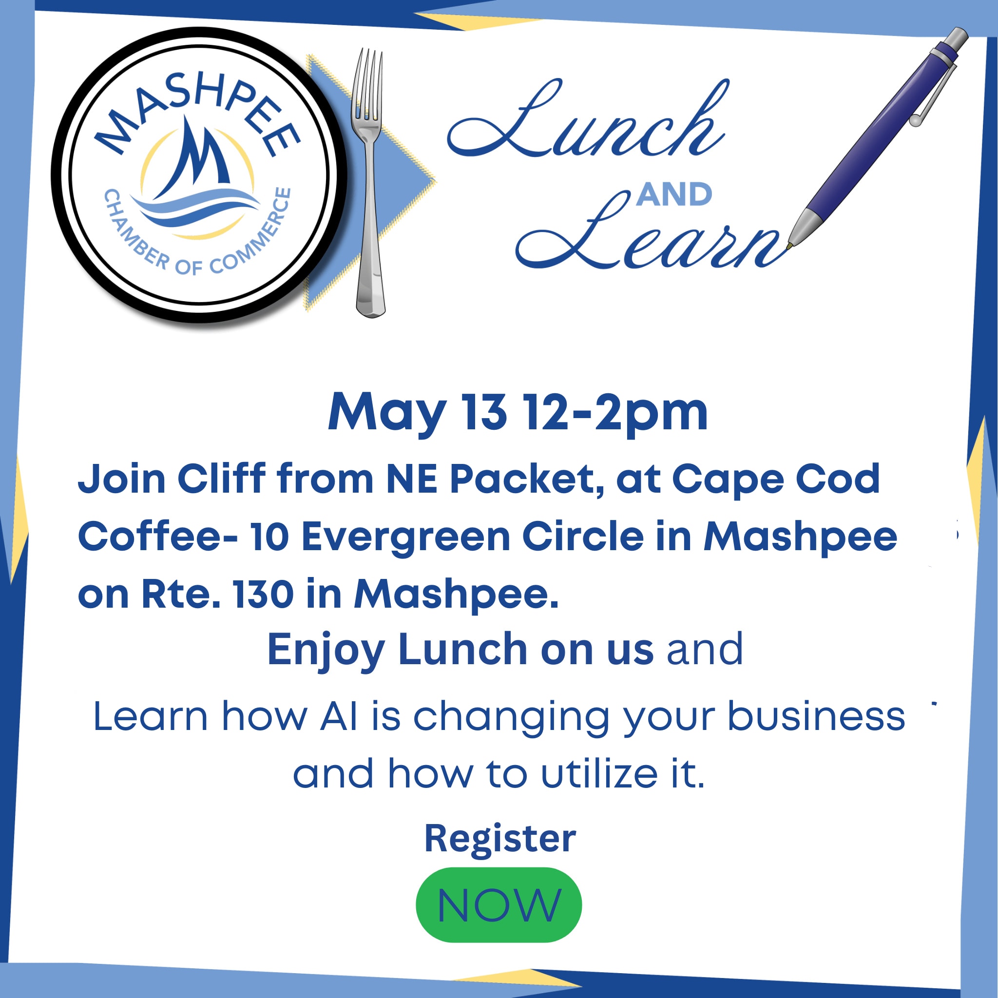Every month we will meet with our members and enjoy a lunch on the Chamber and we will learn a new business skill. In May, we will be meeting over at Cape Cod Coffee on Rte. 130 in Mashpee to hear from NE Packet on AI and its impact on your business processes. This is free for members and $20 for Non-Members.Images