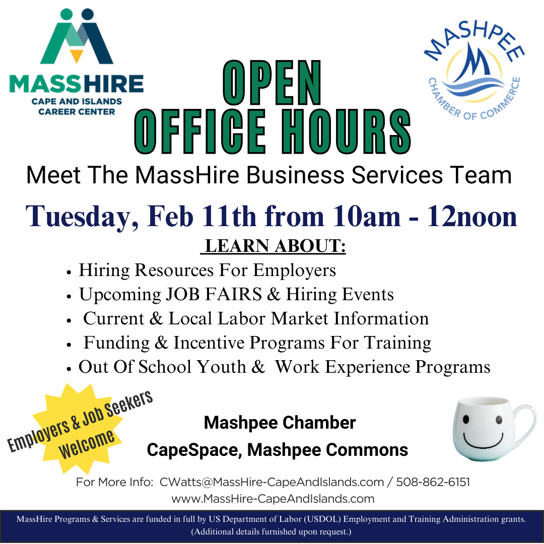 Attention all employers & job seekers! Join the Mashpee Chamber at CapeSpace on February 11 at 10am for a Lunch & Learn with MassHire. You'll learn more about the resources available through the MassHire Career Center. Support for job seekers include finding a job, locating training and education programs, re-employment services, and job support for veterans and individuals with disabilities. Support for employers include recruiting your workforce, MassHire BizWorks, and developing talent. Open to the public - Drop-ins welcome!