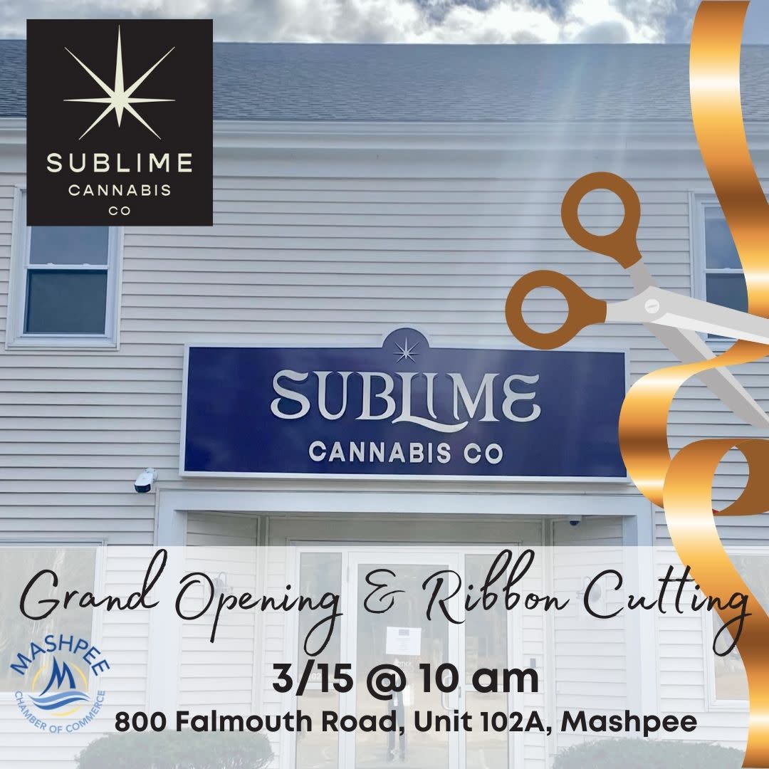 Sublime Cannabis Co. has opened a brand new recreational dispensary at 800 Falmouth Road, Unit 102A in Mashpee. In celebration, the Mashpee Chamber of Commerce will host a Grand Opening and ribbon-cutting on Friday, March 15th at 10 am. Attendees are welcome to observe and shop the store afterward at their leisure. This event is open to the public.Images