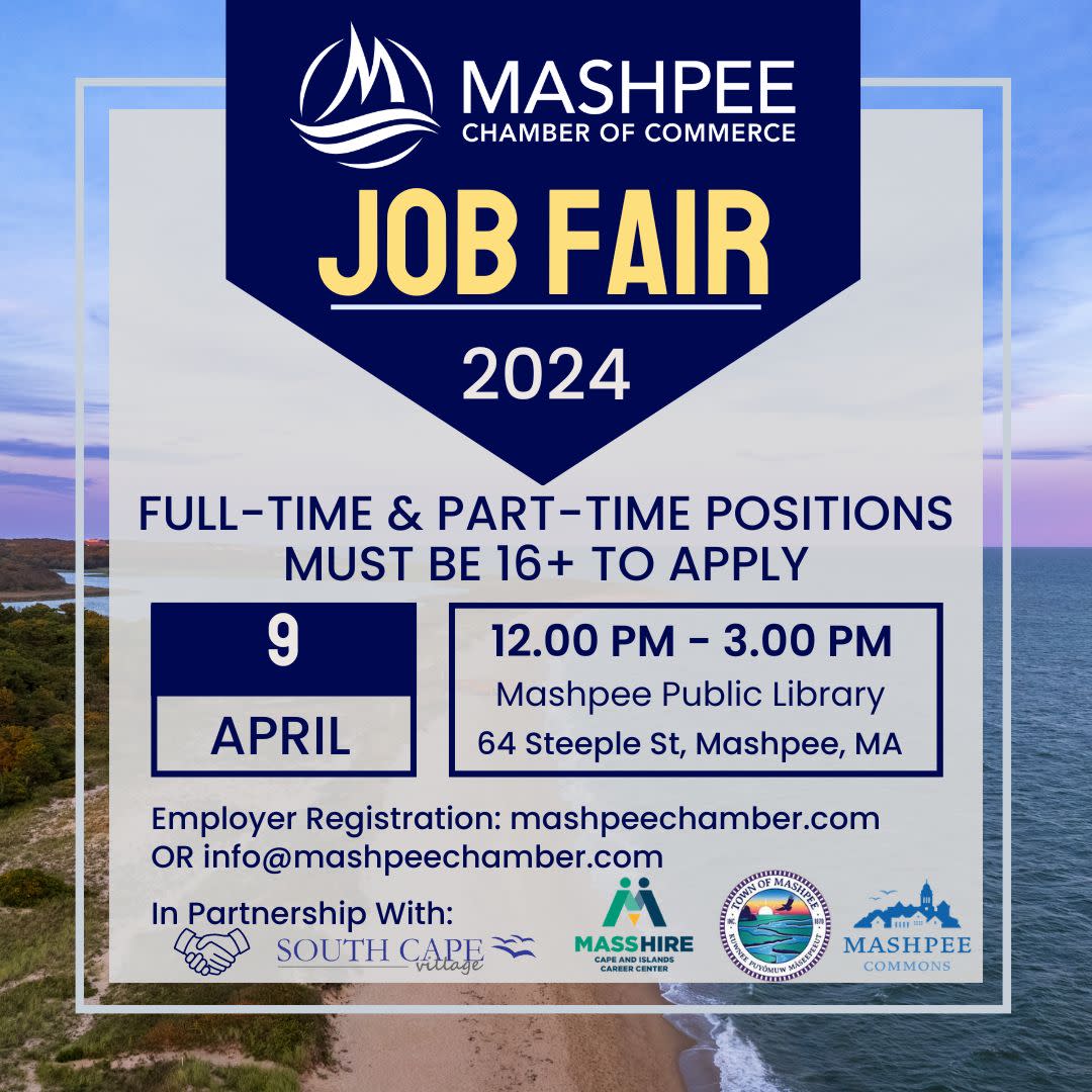 Employers, gain employees for full-time or part-time status right here in Mashpee! In Partnership with MassHire, the Mashpee Public Library, Mashpee Commons, and South Cape Village, we invite you to secure your space for the 4/9 event. Set up will be 11:30 am with the actual event beginning at 12 pm - 3 pm. Please feel free to contact us with any questions at info@mashpeechamber.comImages